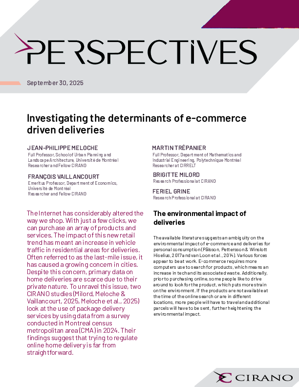 The Internet has considerably altered the way we shop. With just a few clicks, we can purchase an array of products and services. The impact of this new retail trend has meant an increase in vehicle traffic in residential areas for deliveries. Often referred to as the last-mile issue, it has caused a growing concern in cities. Despite this concern, primary data on home deliveries are scarce due to their private nature. To unravel this issue, two CIRANO studies look at the use of package delivery services by using data from a survey conducted in Montreal census metropolitan area (CMA) in 2024. Their findings suggest that trying to regulate online home delivery is far from straightforward.