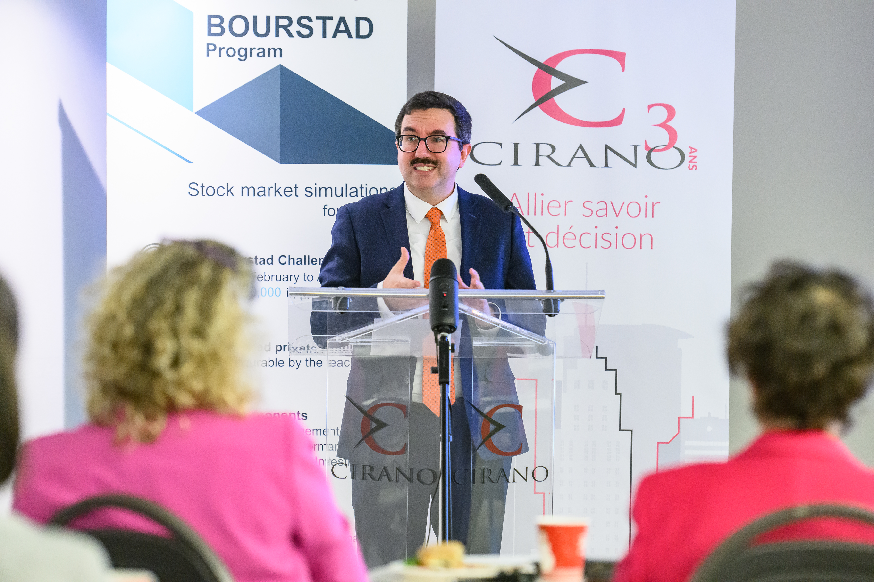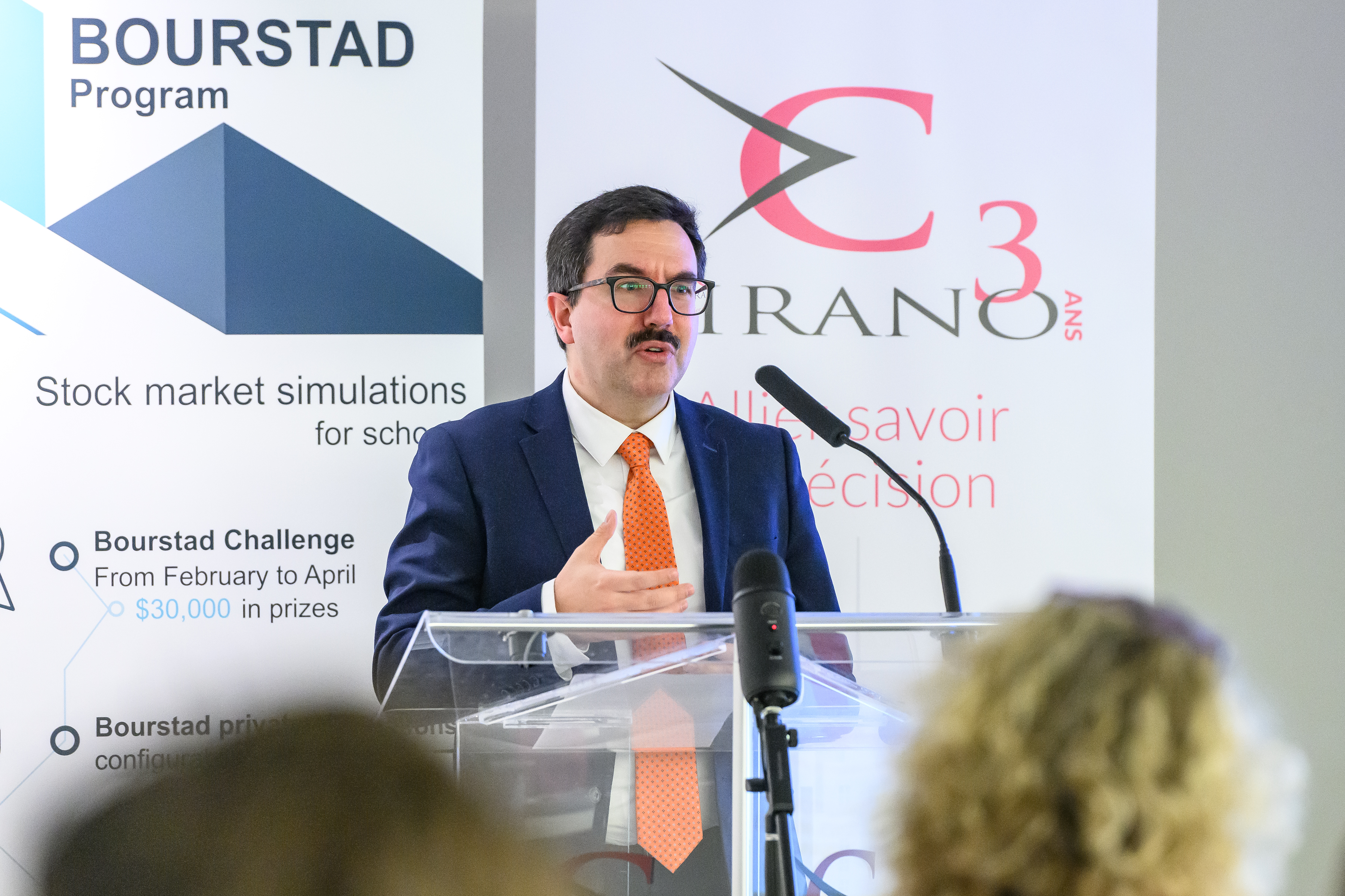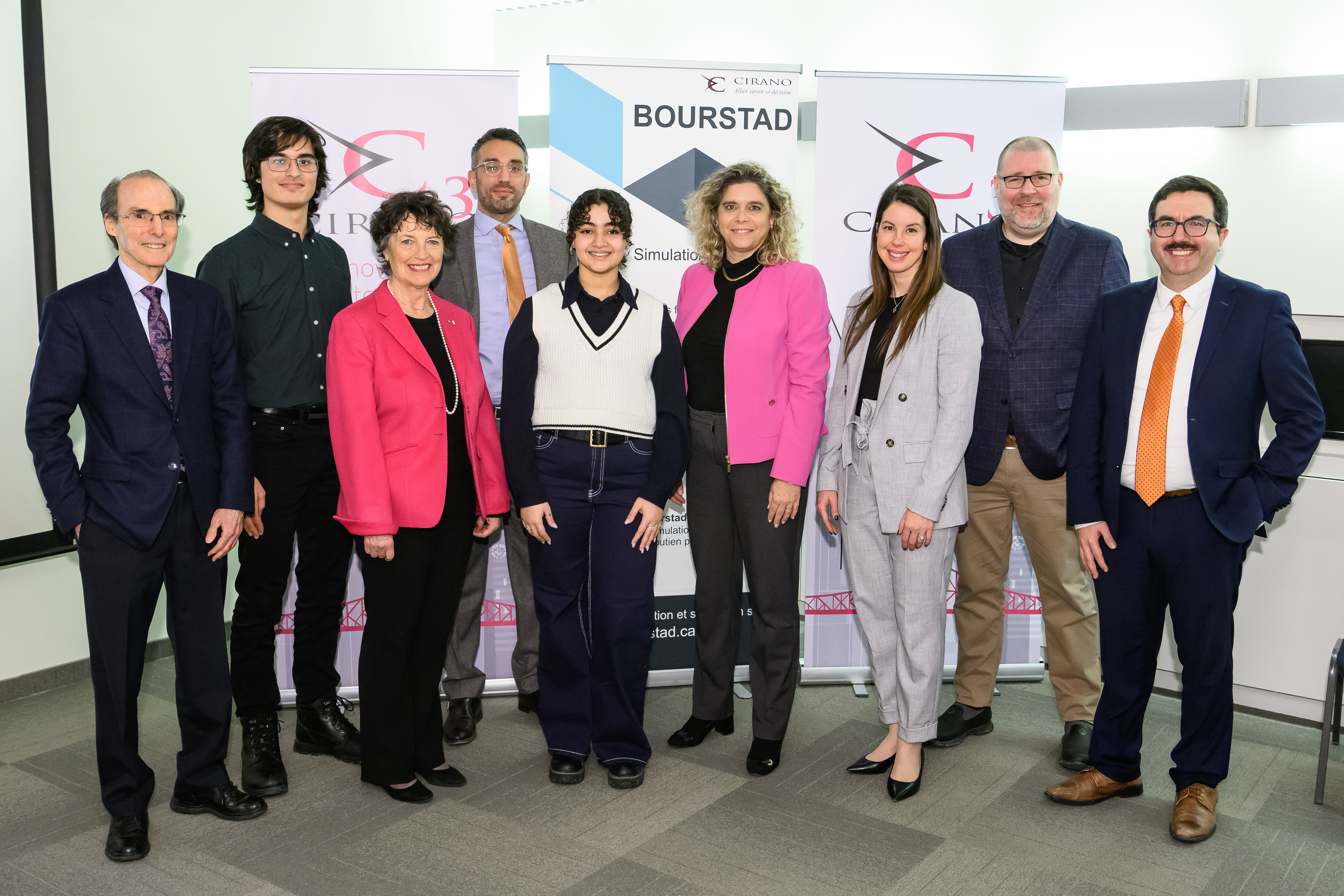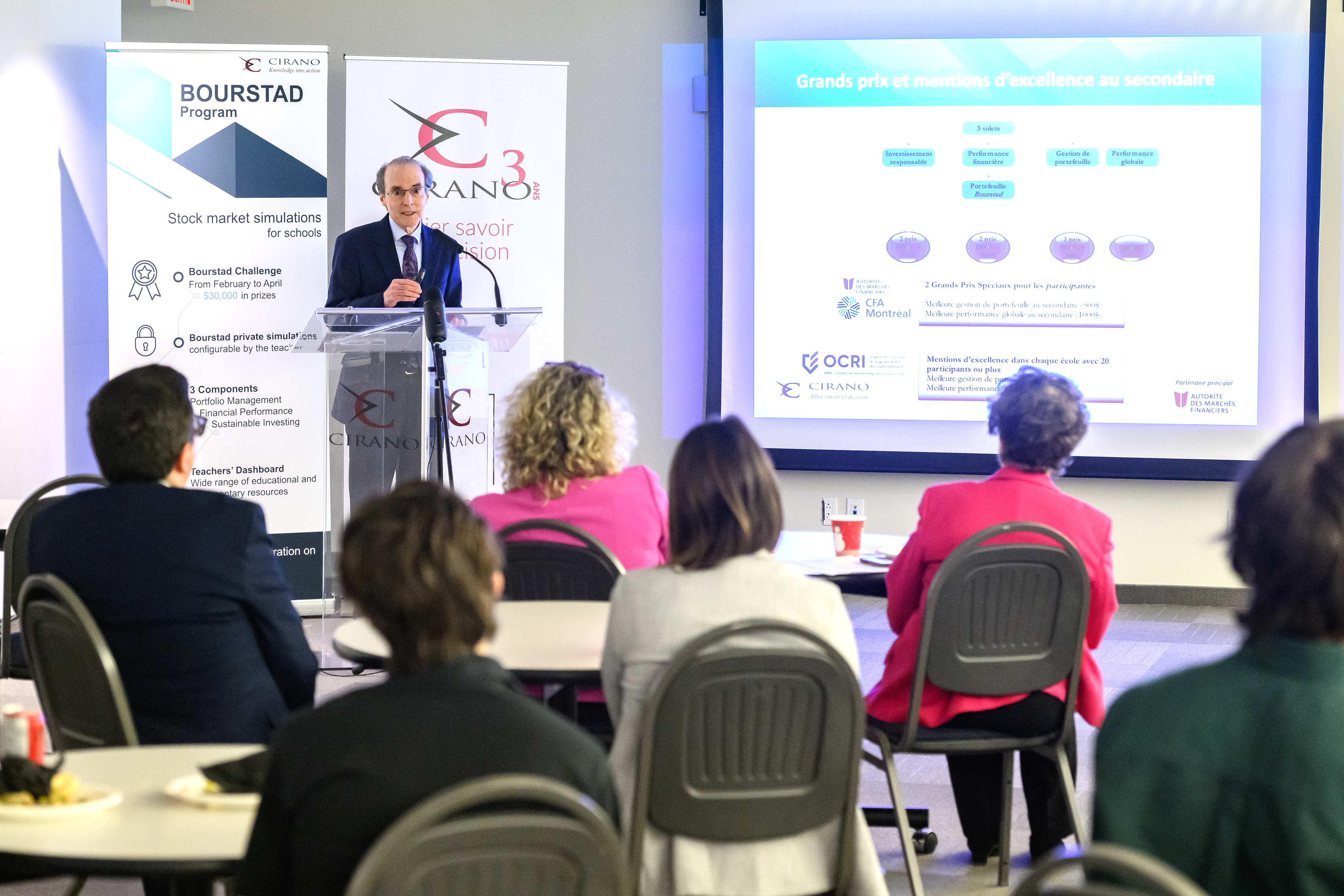 Benoit Desgroseillers, vice-président au développement des talents chez Finance Montréal et président d’honneur du concours Bourstad , Nathalie de Marcellis-Warin, présidente-directrice générale du CIRANO, et Me Alexandre Bardoux, directeur régional de la réglementation à l’OCRI et président du jury du concours Bourstad 2024 étaient présents ainsi que des représentants des commanditaires du concours.