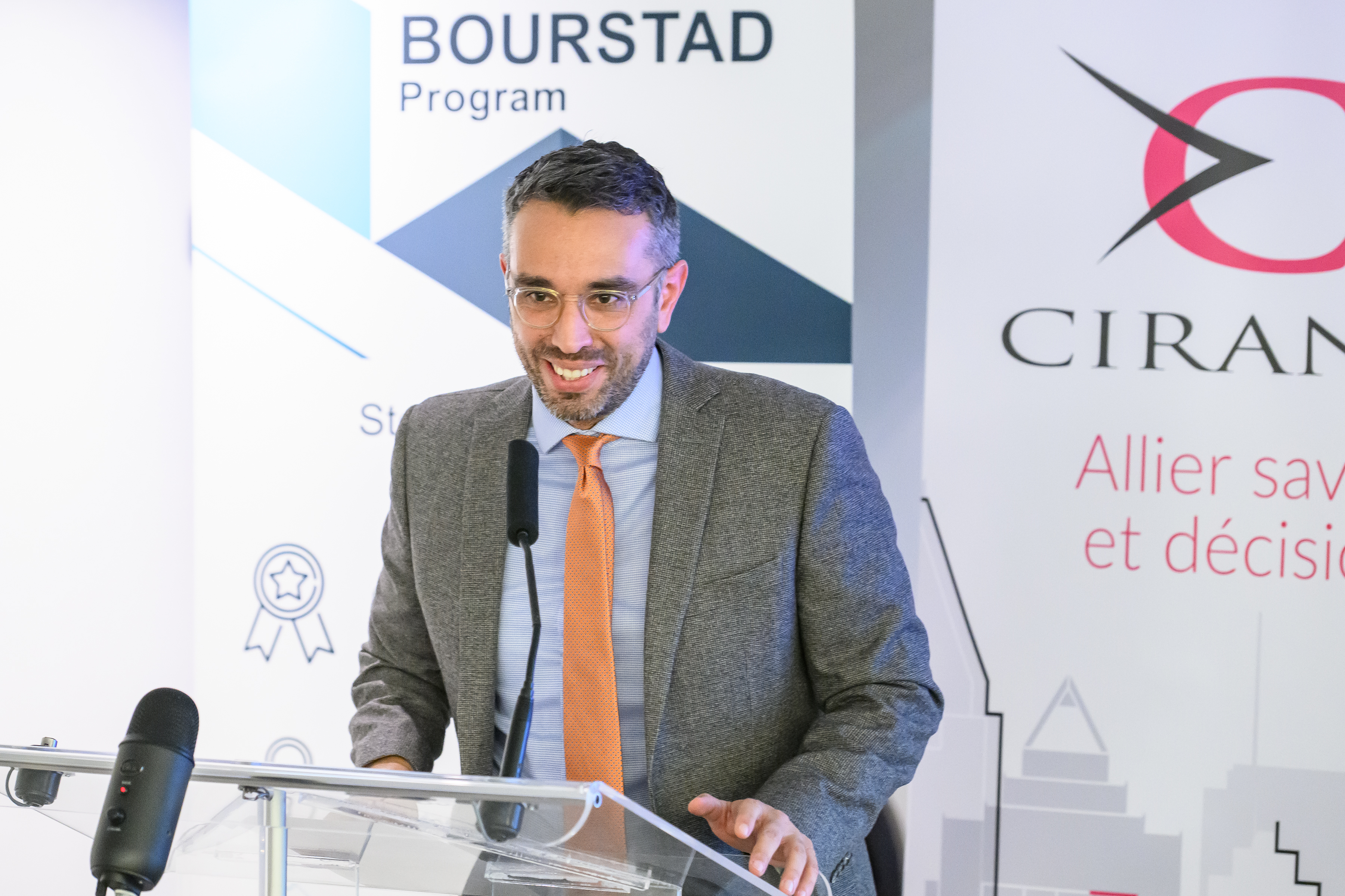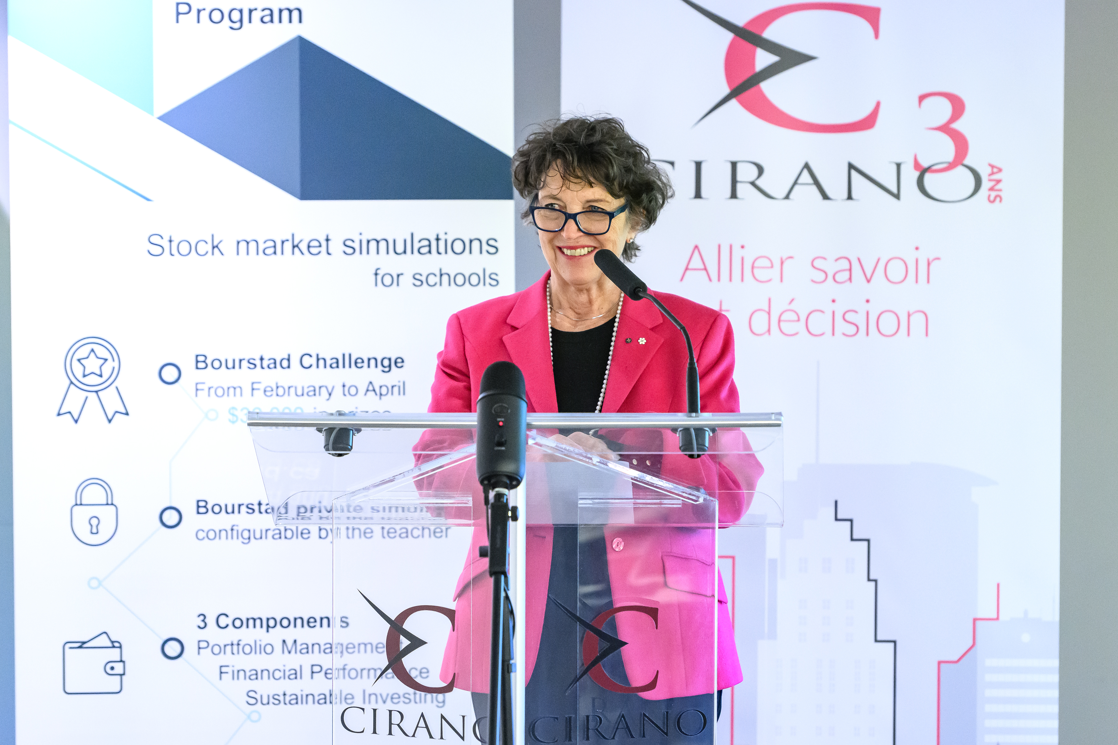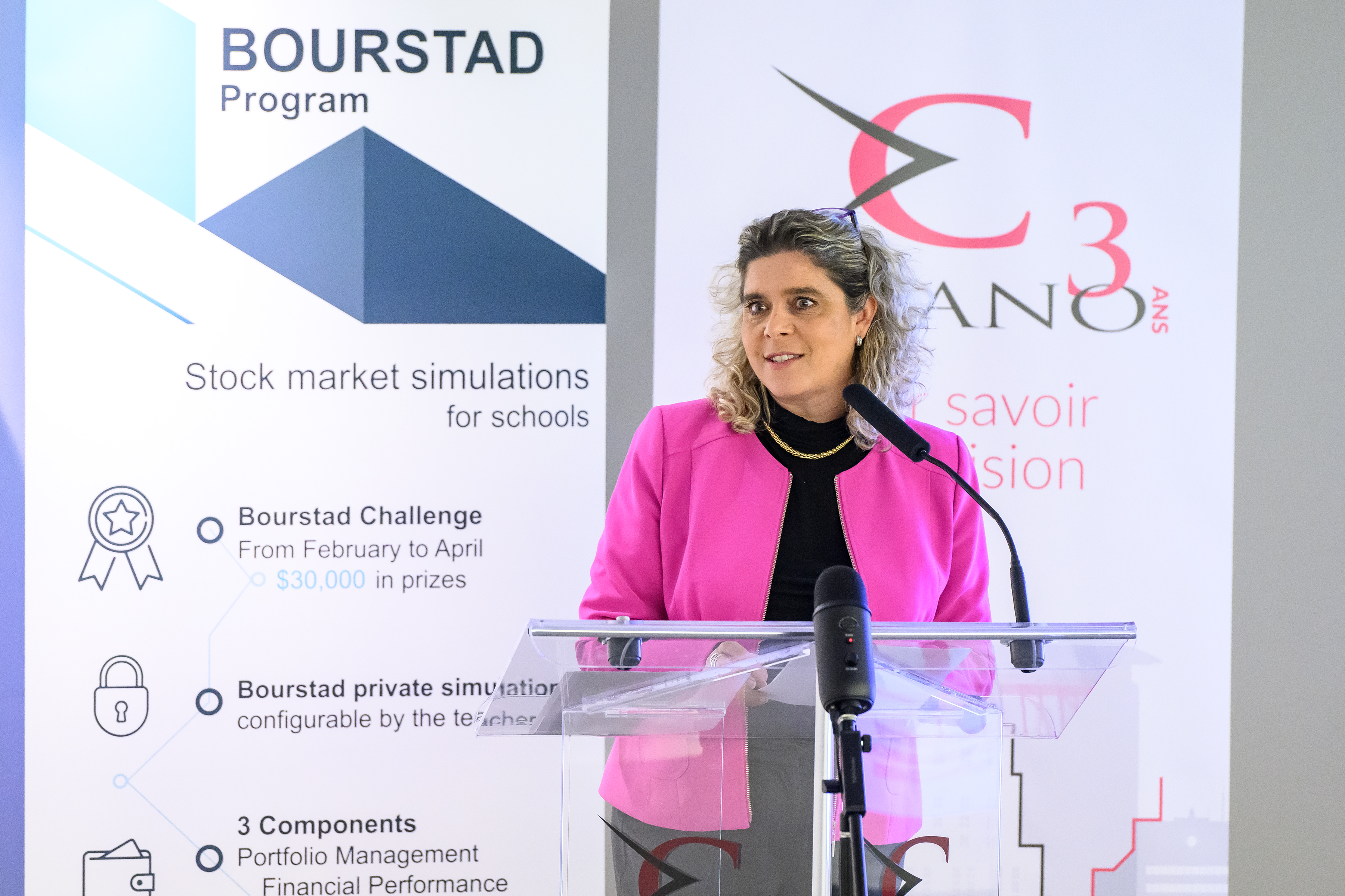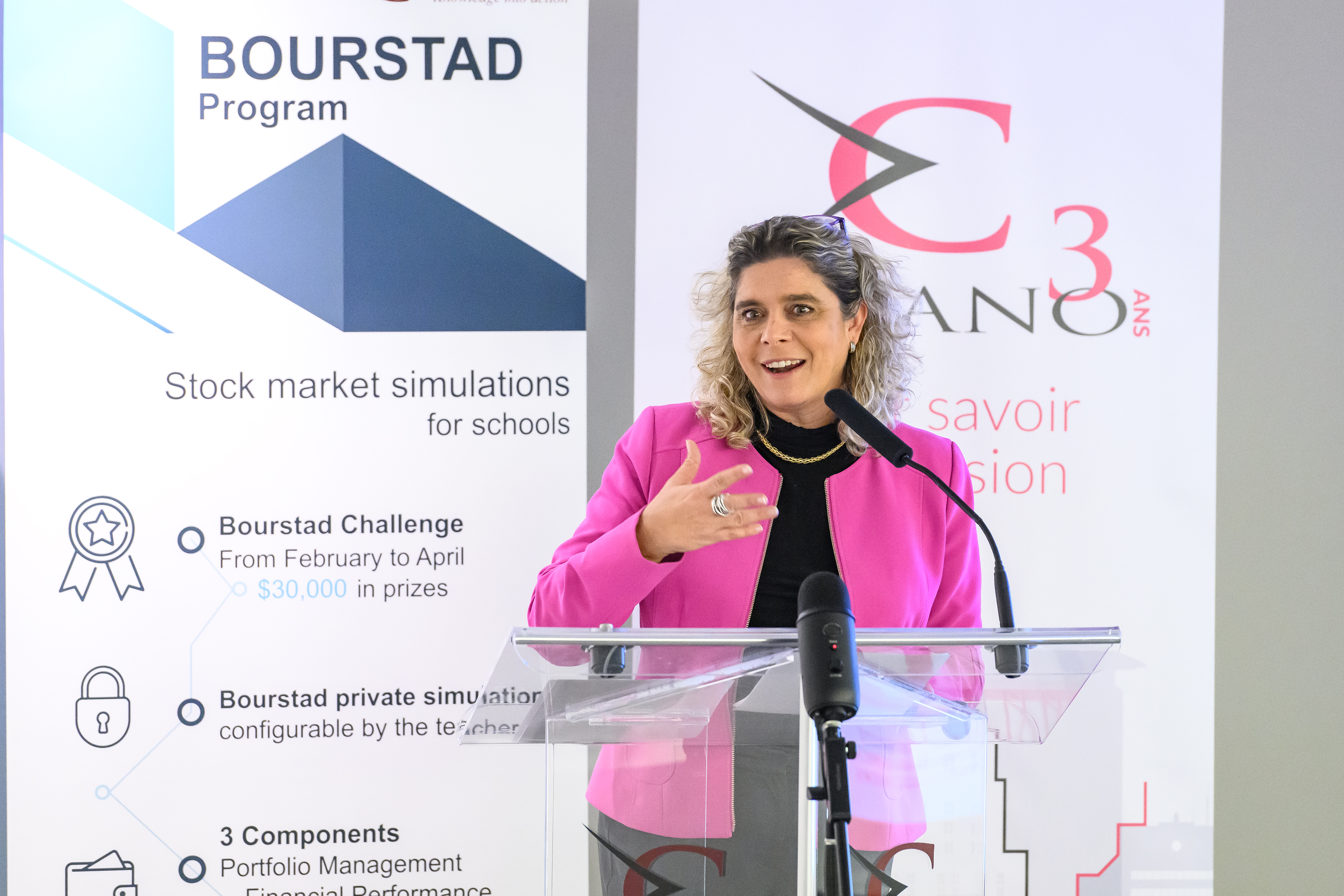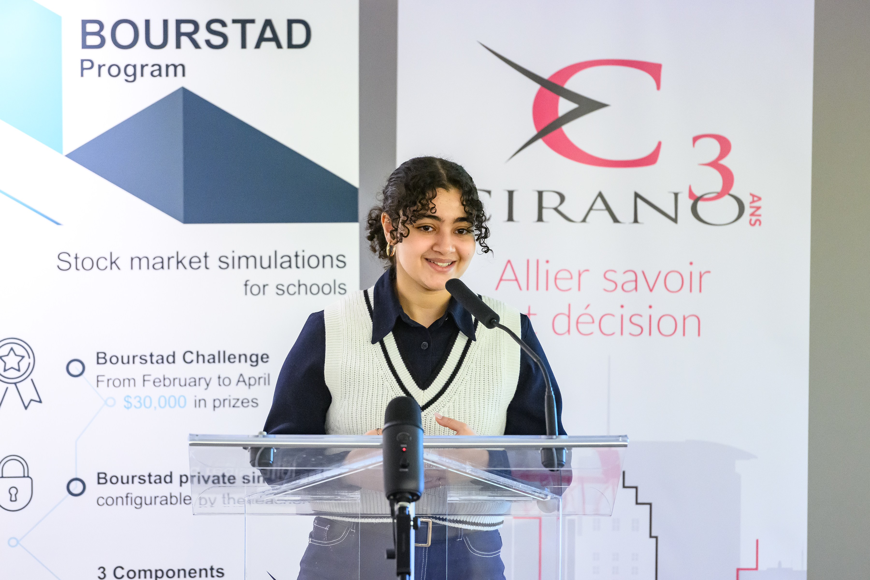 Benoit Desgroseillers, vice-président au développement des talents chez Finance Montréal et président d’honneur du concours Bourstad , Nathalie de Marcellis-Warin, présidente-directrice générale du CIRANO, et Me Alexandre Bardoux, directeur régional de la réglementation à l’OCRI et président du jury du concours Bourstad 2024 étaient présents ainsi que des représentants des commanditaires du concours.