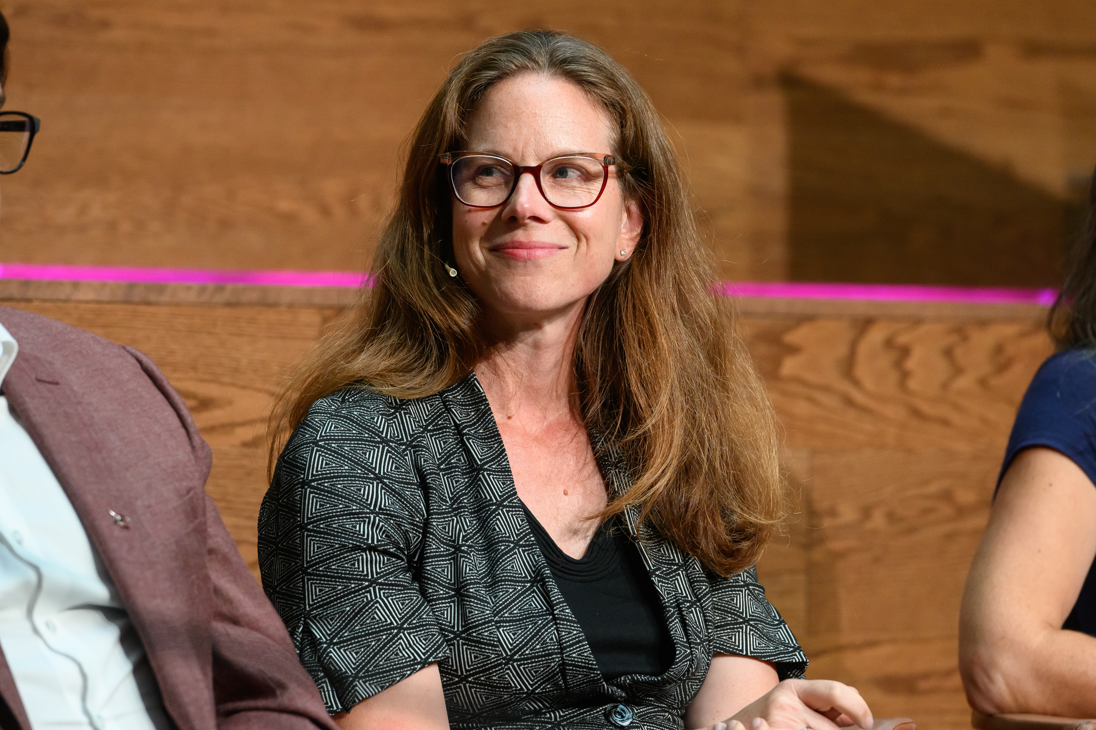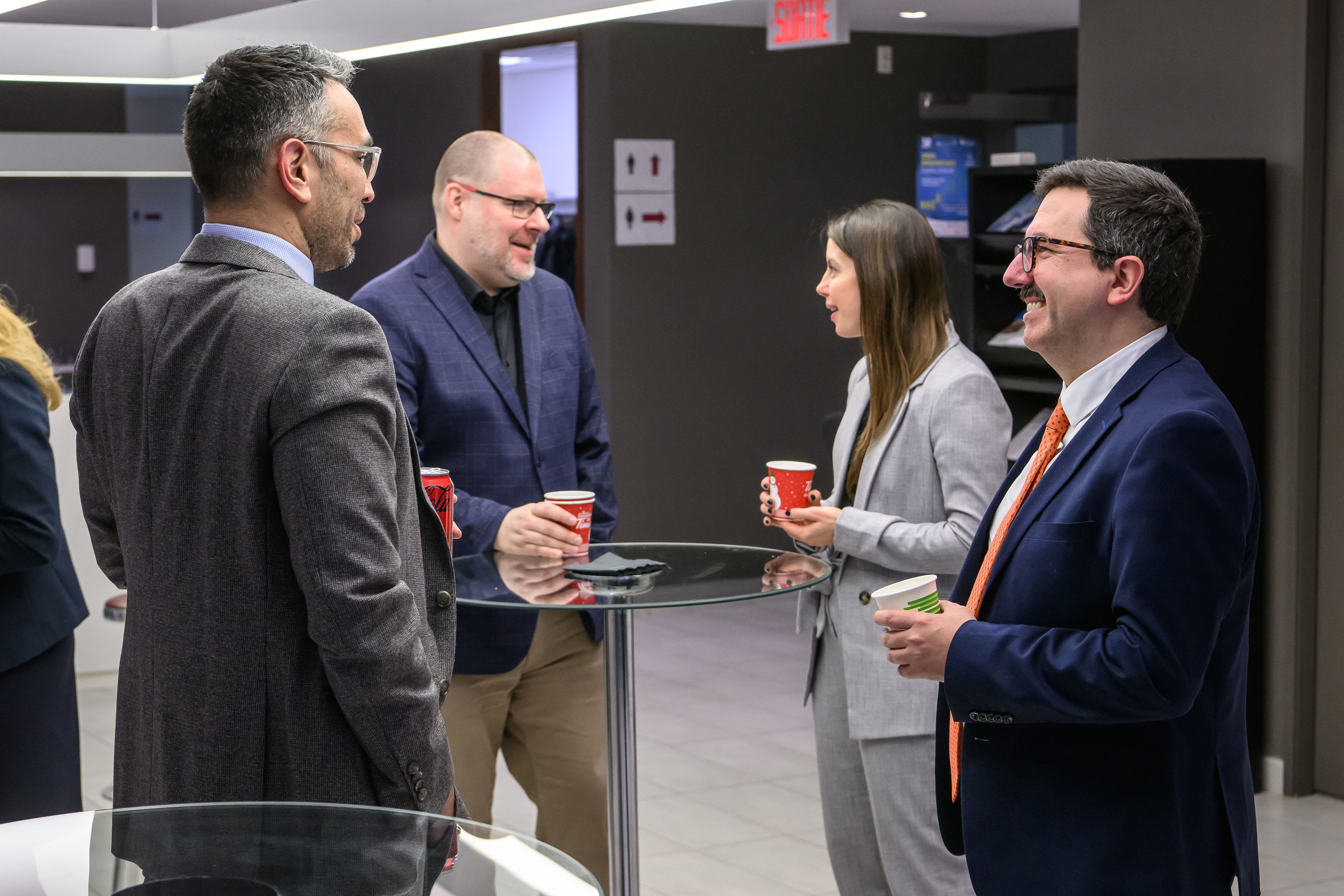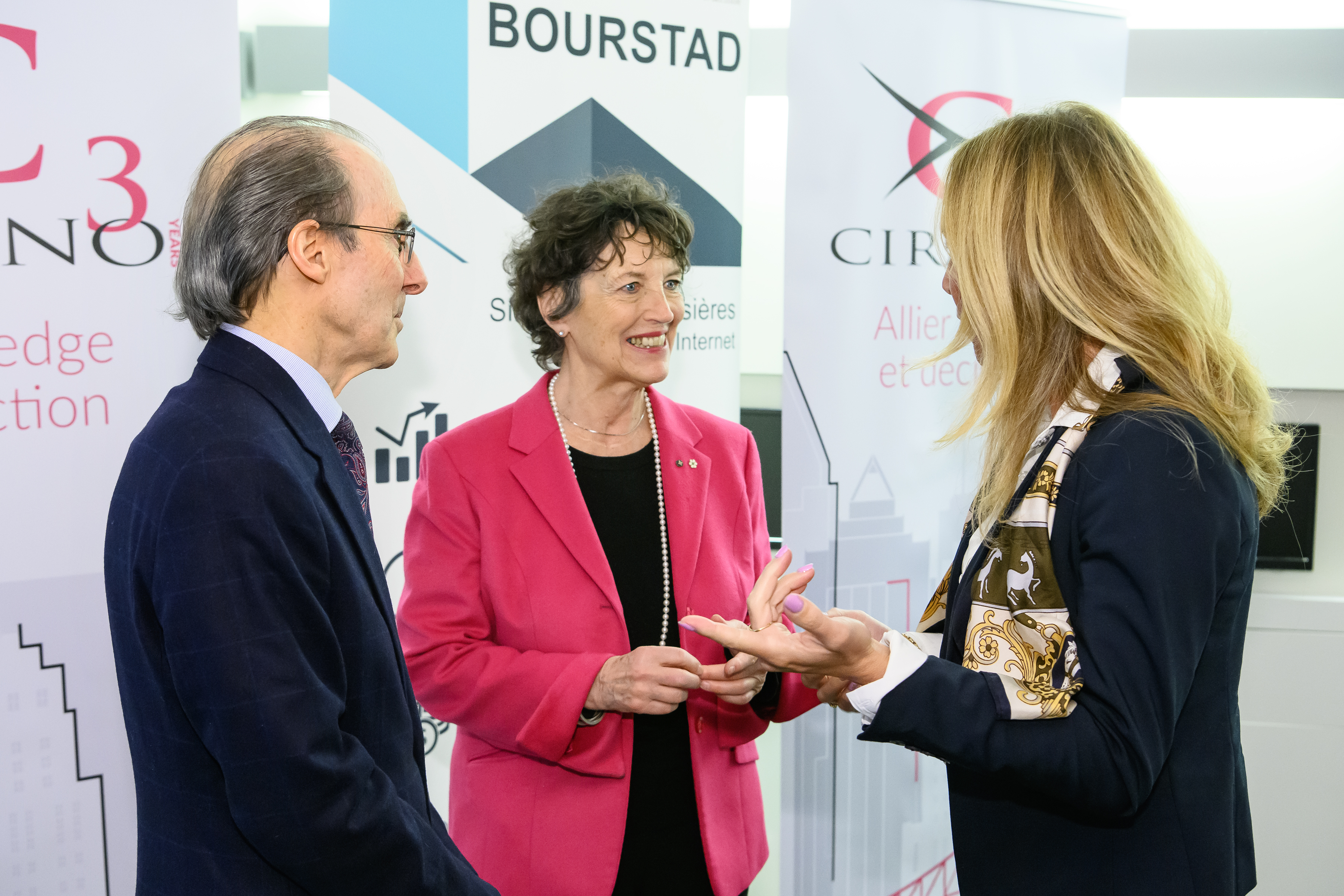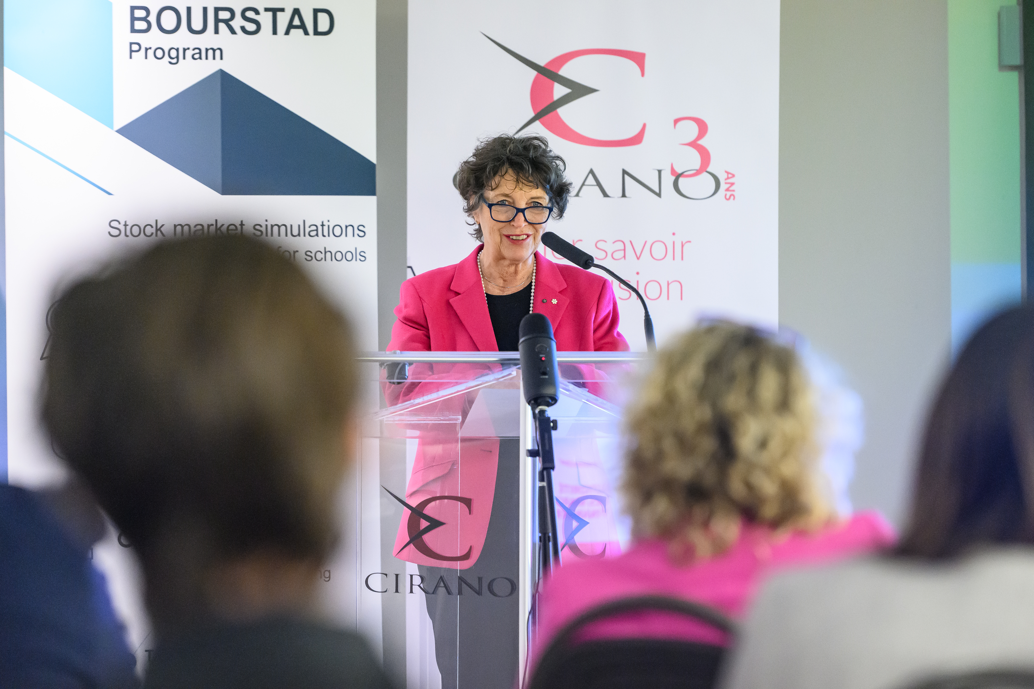 Benoit Desgroseillers, vice-président au développement des talents chez Finance Montréal et président d’honneur du concours Bourstad , Nathalie de Marcellis-Warin, présidente-directrice générale du CIRANO, et Me Alexandre Bardoux, directeur régional de la réglementation à l’OCRI et président du jury du concours Bourstad 2024 étaient présents ainsi que des représentants des commanditaires du concours.