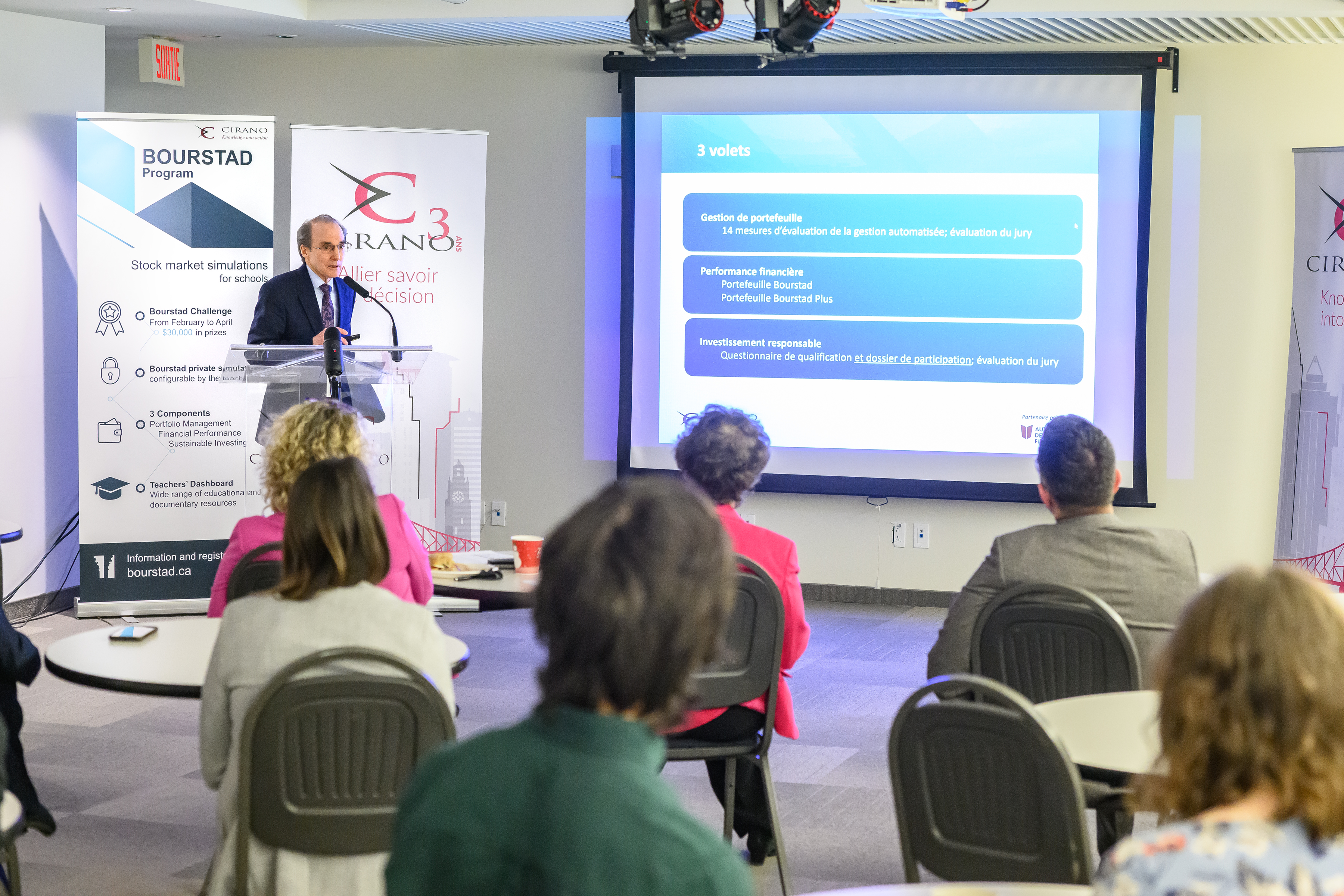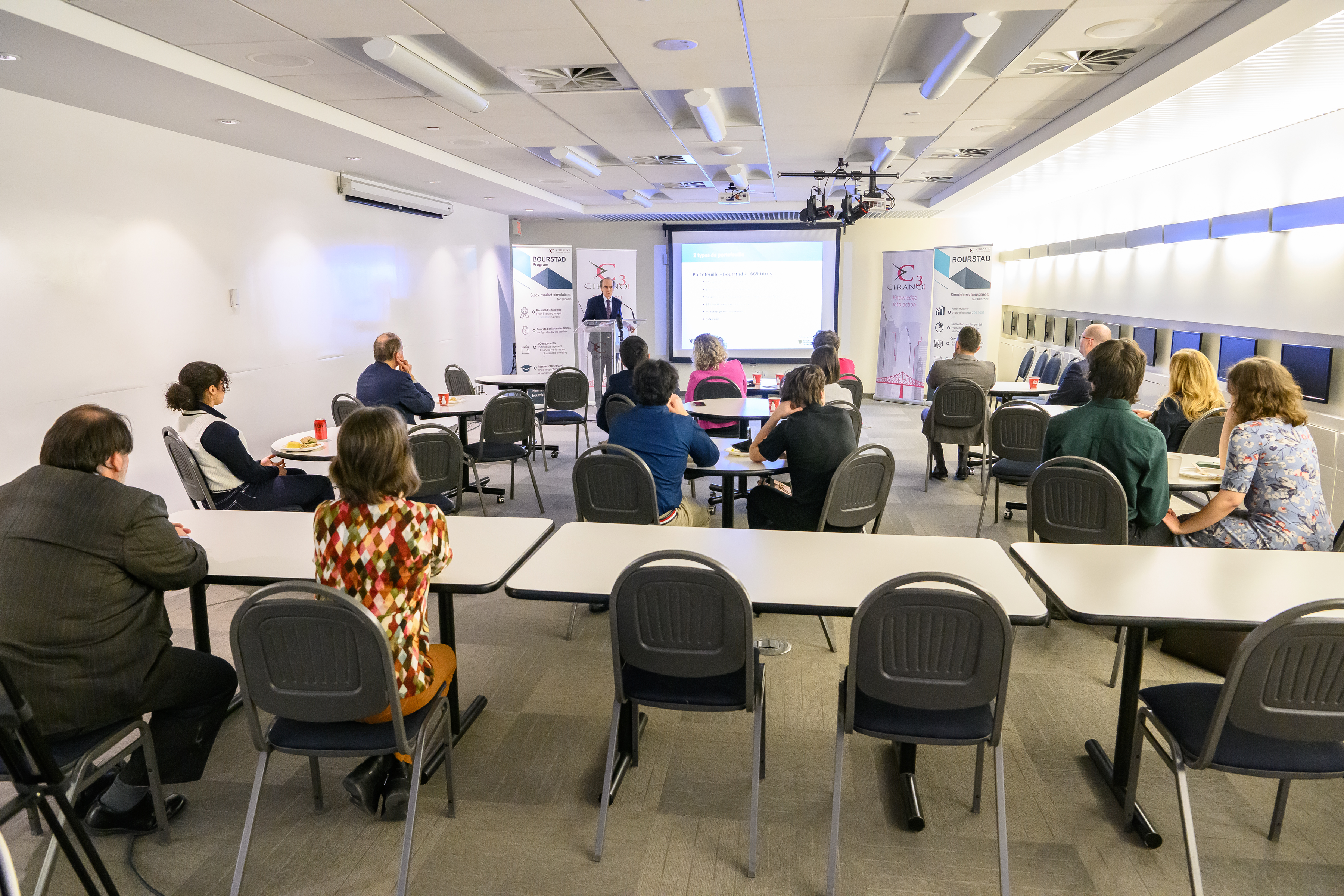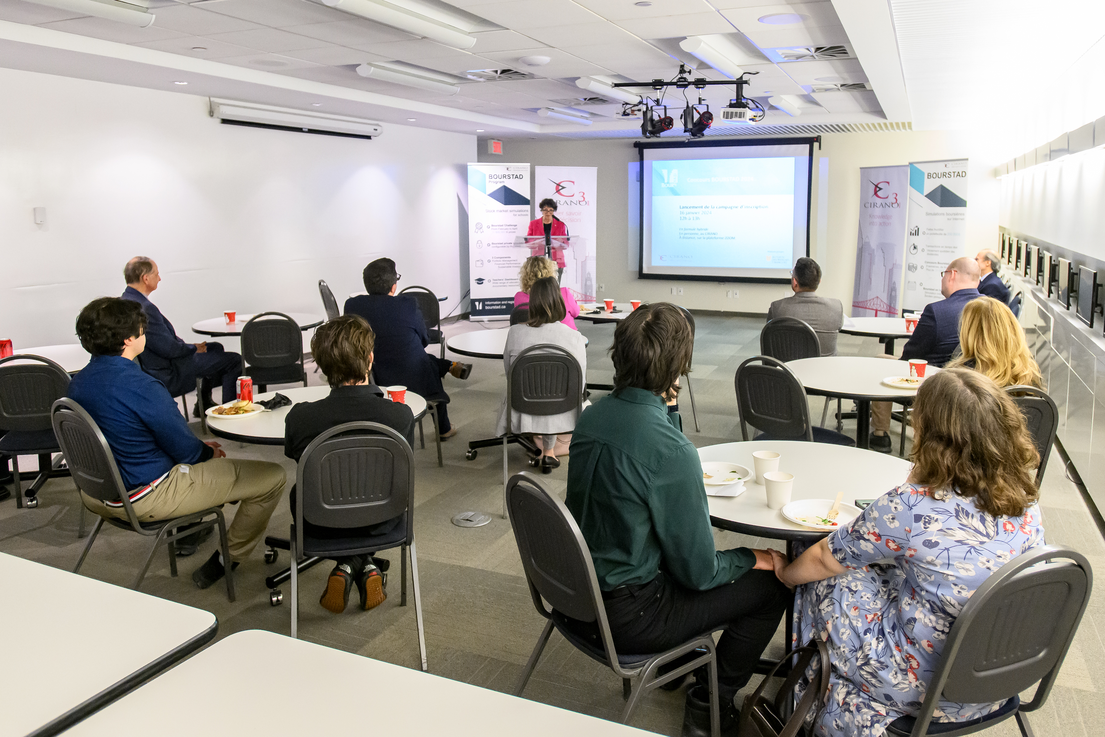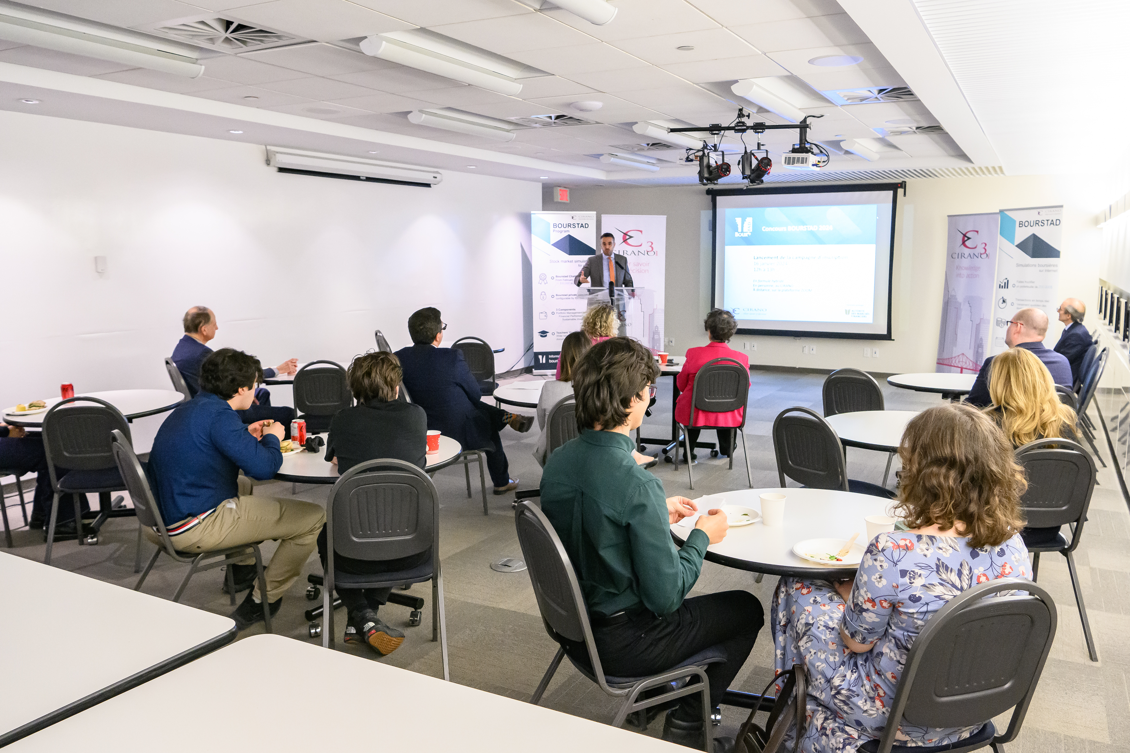 Le CIRANO et son partenaire principal pour cette activité, l’Autorité des marchés financiers (AMF), ont lancé officiellement les inscriptions au concours Bourstad 2024 le 16 janvier 2024, entre midi et 13 heures, événement auquel il était possible de participer en personne ou à distance.
